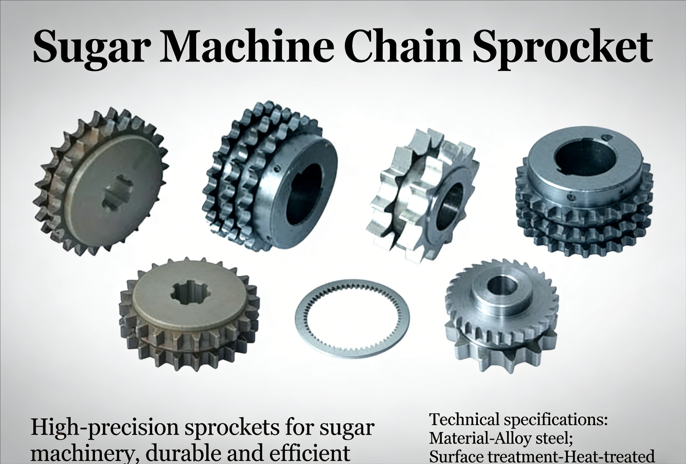 Design: These sprockets feature specific tooth profiles, pitches, and bore sizes optimized for use with chains in sugar processing machinery, ensuring efficient power transmission and reliable operation during various stages of sugar production.